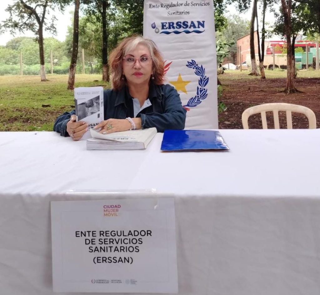 Funcionarios del Ente Regulador de Servicios Sanitarios (ERSSAN) participaron en la jornada de Ciudad Mujer Móvil, realizada en la Unidad de Salud Familiar de Tembiaporã, departamento de Caaguazú, donde brindaron orientación sobre los servicios de agua potable y saneamiento y entregaron resultados de análisis de agua realizados por el laboratorio institucional.